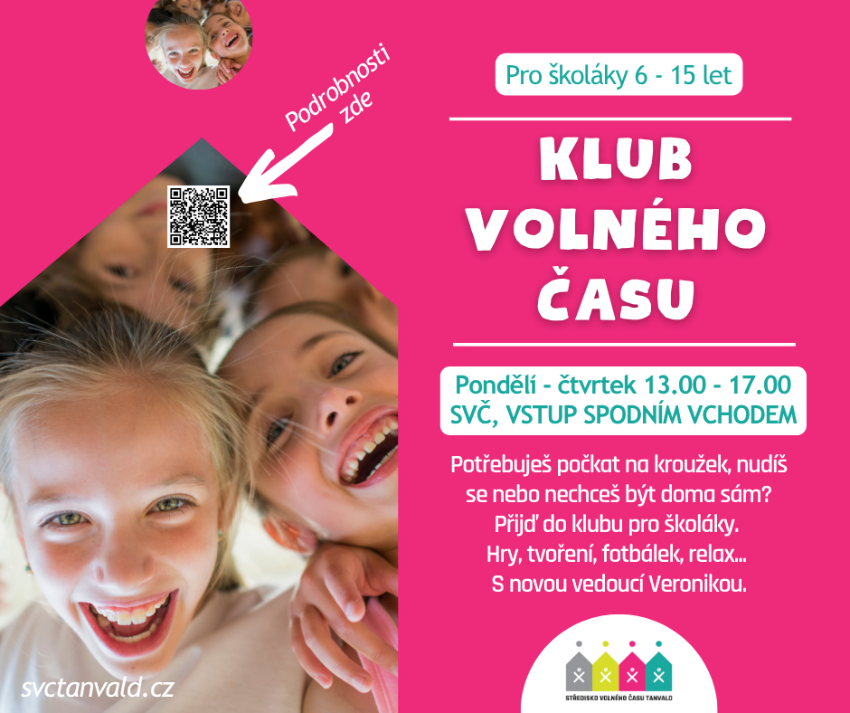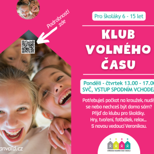 Od pondělí 29. 9. 2025 bude opět v provozu odpolední klub volného času v suterénu. Fungovat bude v zavedeném režimu pondělí až čtvrtek od 13.00 do 17.00. Děti, které v něm budou čekat na kroužek, mají pobyt zdarma, děti, které přijdou vyloženě trávit čas do klubu, platí 20,-. Nová vedoucí Veronika bude chystat program plný tvořivých aktivit a her. Těšit se můžete také na oblíbený fotbálek nebo si prostě můžete přijít jen tak “pokecat” a relaxovat. Do klubu se chodí spodním vchodem od hřiště, zvoňte u dveří. Přezůvky s sebou.