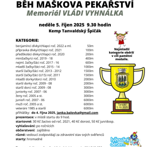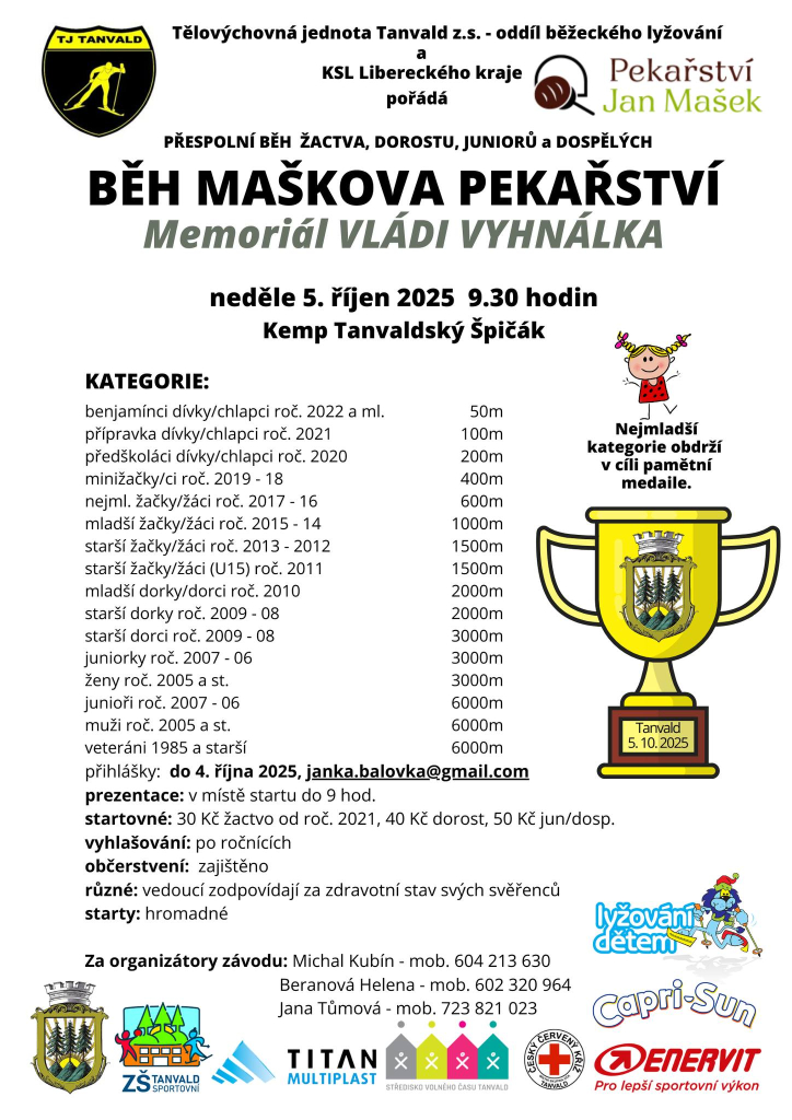 V neděli 5. 10. 2025 zveme všechny běžecké nadšence na přespolní Běh Maškova pekařství - Memoriál Vládi Vyhnálka do tanvaldského kempu. Podrobnosti v letáčku.