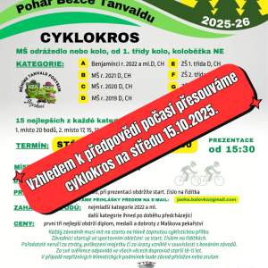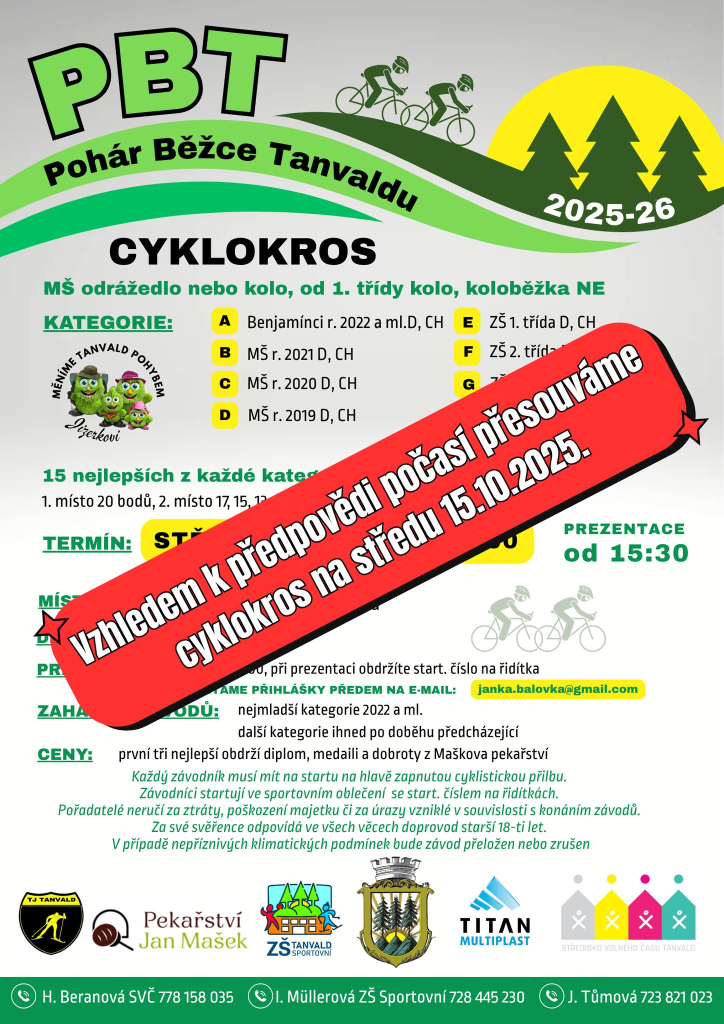 Kvůli deštivému počasí je dnešní závod PBT v cyklokrosu přeložen na příští středu, snad bude počasí přívětivější... Děkujeme za pochopení.