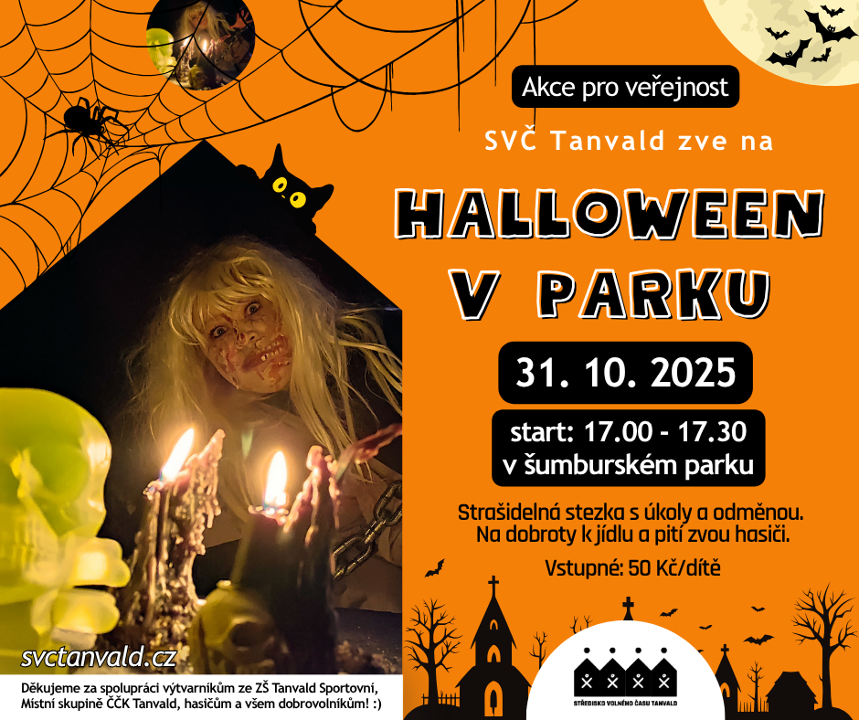 I letos chystáme oblíbený HALLOWEEN V PARKU - strašidelnou stezku s úkoly a odměnou na konci pro všechny odvážlivce. Chybět nebude ani výborné občerstvení, tentokrát se o něj postarají hasiči. V pátek 31. 10. mezi 17.00 a 17.30 se na vás těšíme v šumburském parku. Hlavně na všechny dýňáčky, kostlivce, duchy, zombíky, čarodějnice…:)