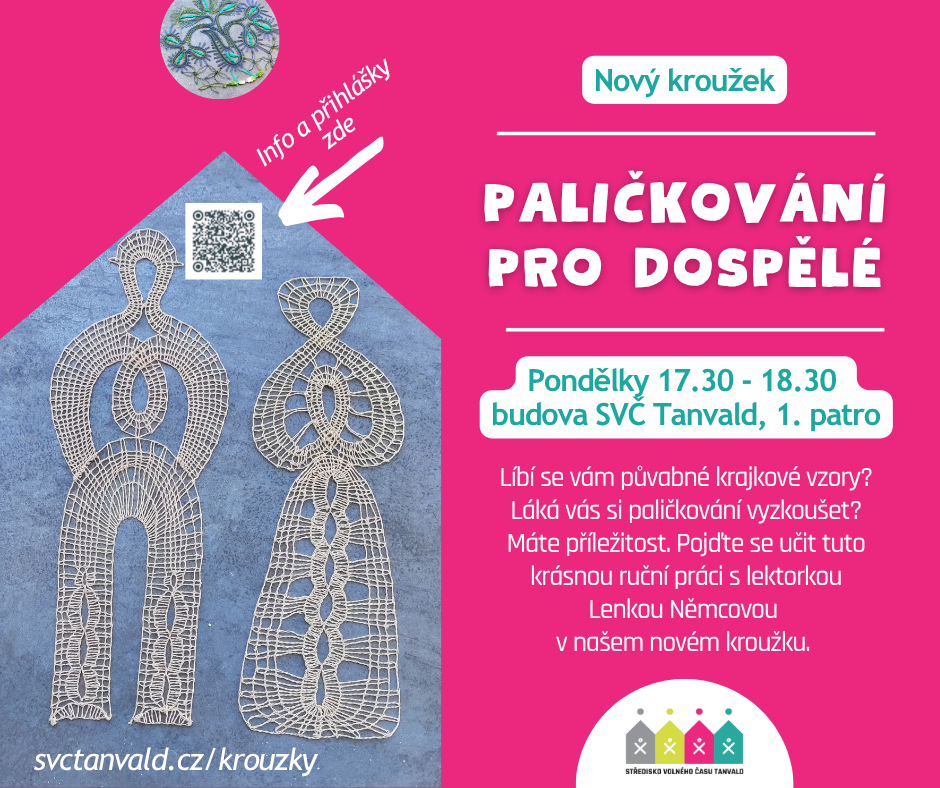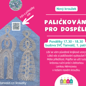 Lákal vás kroužek Paličkování pro dospělé, ale nevyhovovaly vám čtvrtky? Nově ho nabízíme v pondělí mezi 17.30 a 18.30. Hlásit se můžete zde: https://www.svctanvald.cz/krouzky/1078-palickovani-pro-dospele