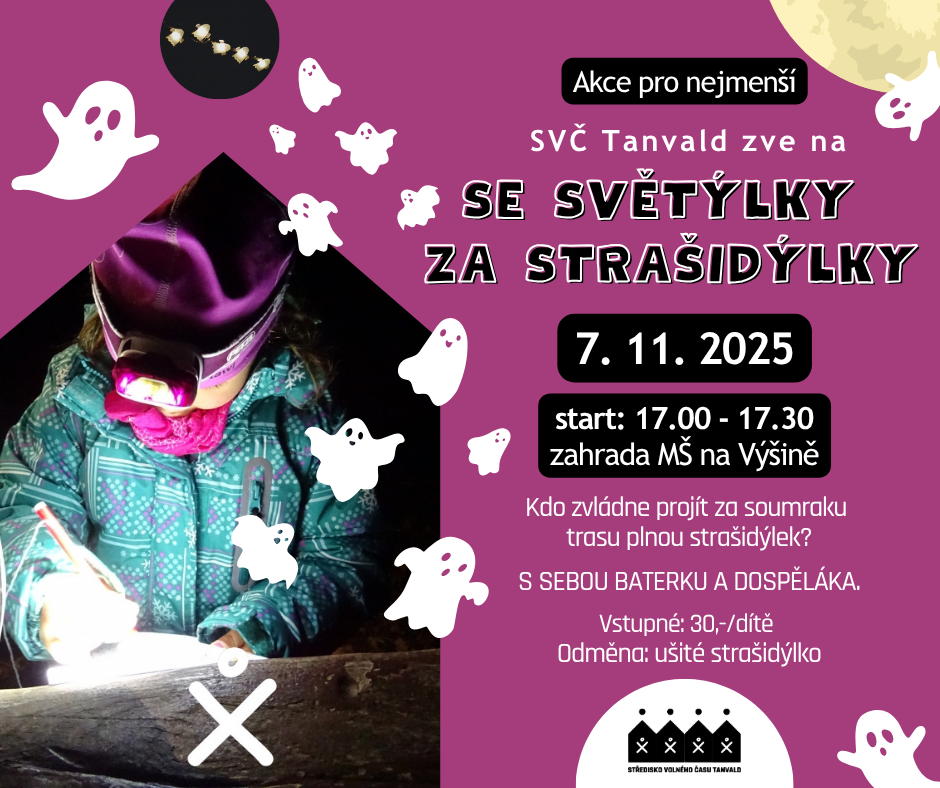 Zveme všechny předškoláčky, kteří mají pro strach uděláno a troufnou si s baterkou lovit strašidýlka v potemnělých koutek zahrady školky na Výšině, na tradiční akci Se světýlky za strašidýlky. S sebou si nezapomeňte baterku a svého dospěláka. Na akci není nutné se přihlašovat. Startuje se průběžně meuzi 17.00 a 17.30. Více v letáčku.