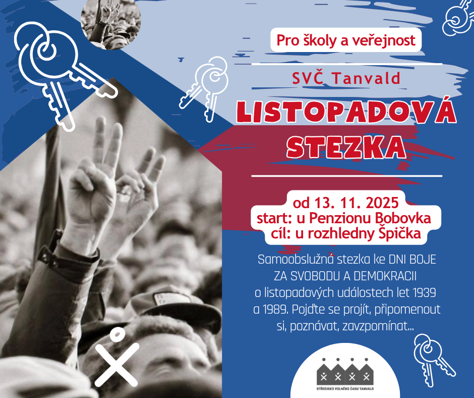 Blíží se Den boje za svobodu a demokracii. Chcete si s dětmi připomenout, proč ho slavíme? Pojďte se projít na rozhlednu Špička a využijte naši Listopadovou stezku. Zveme školní kolektivy i veřejnost. Více v letáčku.