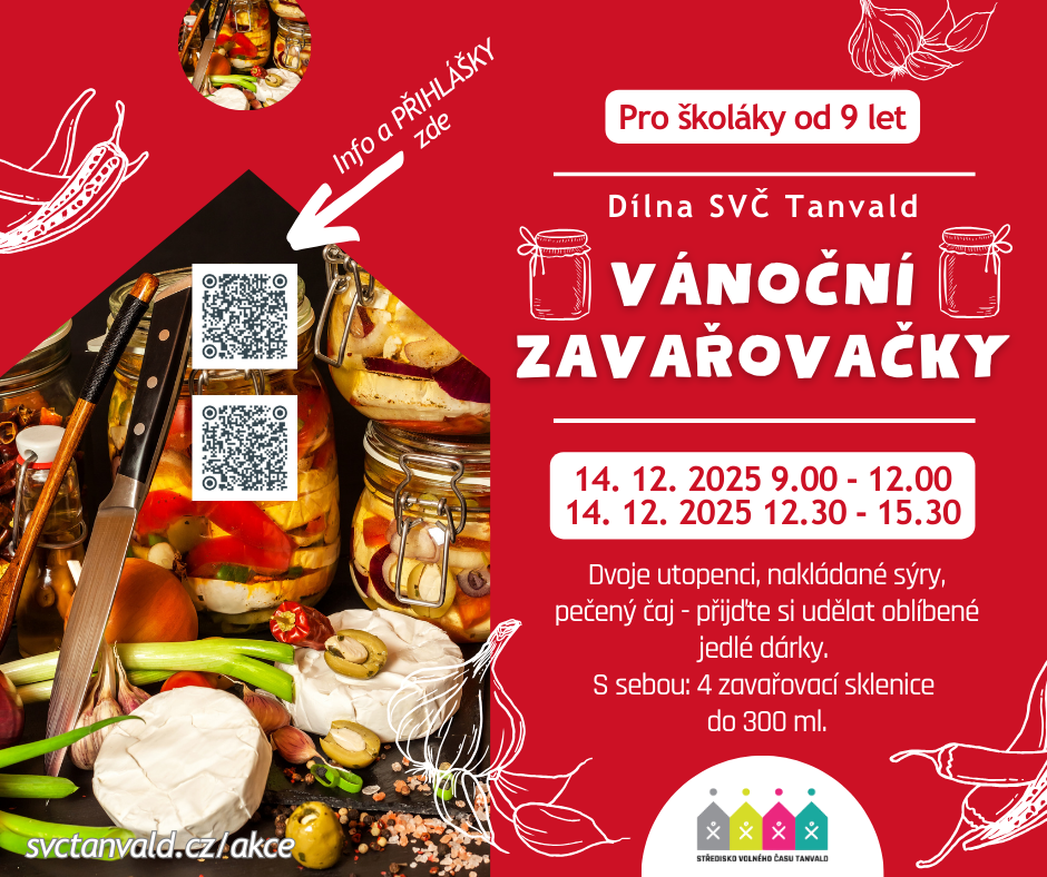Ani letos vás neochudíme o oblíbené Vánoční zavařovačky s Markétou K. Ukuchtit si skvělé jedlé dárky (utopence, nakládané sýry a pečený čaj) můžete 14. 12. 2025. Buď dopoledne, nebo odpoledne, jak se vám to hodí. Neváhejte, počet míst je omezený. Přihlášky zde: https://www.svctanvald.cz/akce/1109-vanocni-zavarovacky-dopoledne a zde: https://www.svctanvald.cz/akce/1110-vanocni-zavarovacky-odpoledne