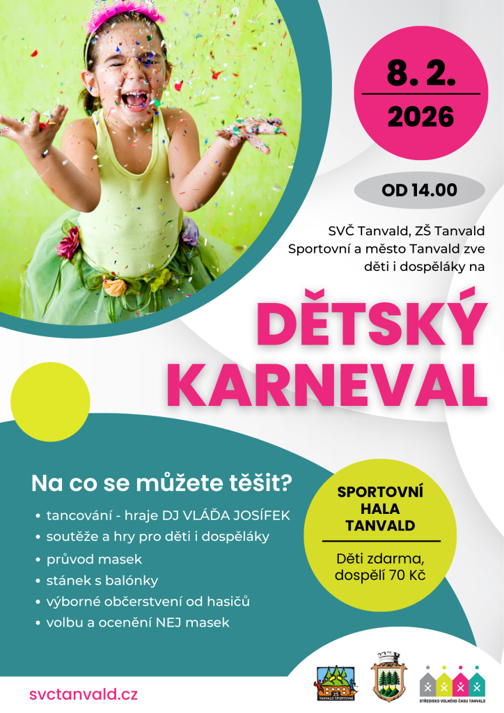 Po plese města se tradičně můžete těšit na Dětský karneval. Odehraje se 8. 2. 2026 od 14.00 v tanvaldské hale. Chystejte kostýmy, naše švadlenky už šijou skřítky mazlíky za odměnu pro ty nejoriginálnější masky. Užijeme si tancování, soutěže pro děti i dospěláky i průvod masek. Chybět nebude ani stánek s balónky a super občerstvení od hasičů. Vstup pro děti zdarma, dospělí 70 Kč.