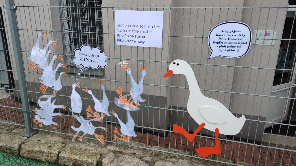 Nové hraní na našem hřišti je inspirované knihou Petra Horáčka Husa Líza. Určené je zejména předškolním a nejmladším školním dětem. Pojďte si s husou Lízou vyzkoušet, jaké je to “být jiná” a stát se na okamžit netopýrem, slonem, žirafou nebo třeba lvem, který umí pořádně zařvat. Zjistíte, co se stane, když takového lva probudíte. A že je někdy fajn být stejný jako ostatní. Ale ne pořád….:) Přijďte se hýbat, skotačit i přemýšlet… Hřiště je přístupné v otevírací době SVČ. Kdo bude mít chuť, může huse Líze nechat vzkaz ve schránce na okně (tak jako medvědičce Flóře). Všechny malé dobrodruhy srdečně zveme!